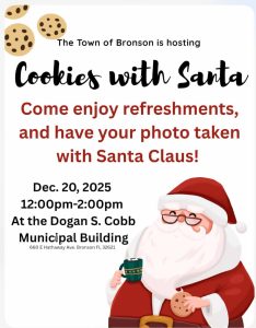 Hey kids! Come get your picture taken with Santa and enjoy some cookies and cocoa, too! Santa will be at the Dogan S. Cobb Municipal Building, 660 E. Hathaway Ave., Bronson, Fla., 32621, on December 20, 2025, from 12 noon until 2 pm. You don’t want to miss this chance to tell Santa what’s on your Christmas List!